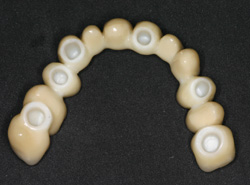 Labortechnisch individualisierte Abutments (Aufbrennkeramik) in Verbindung mit einer Vollkeramik-Restauration.